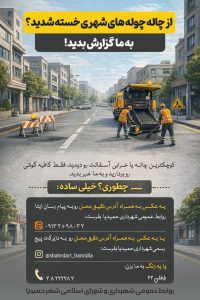🛣️ از چالهچولههای خیابانها و کوچههای شهر خسته شدهاید؟ ما در شهرداری حمیدیا مصمم هستیم تا با اجرای طرح «نهضت بهسازی و لکهگیری آسفالت»، چهره شهر را زیباتر و مسیرها را هموارتر کنیم. 👀 اما برای موفقیت این طرح، به چشمهای تیزبین و همراهی شما در تمام محلهها نیاز داریم! هرجا کوچکترین خرابی یا چالهای در آسفالت دیدید، کافیست به یکی از سه روش زیر به ما اطلاع دهید: 1️⃣ ارسال عکس در ایتا: یک عکس واضح، به همراه آدرس دقیق به شماره زیر در ایتا ارسال کنید: 📱 ۰۹۱۳۳۵۹۸۰۳۲ 2️⃣ ارسال پیام در اینستاگرام: عکس و آدرس دقیق را به دایرکت پیج رسمی شهرداری حمیدیا بفرستید: 📥 shahrdari_hamidia@ 3️⃣ تماس تلفنی مستقیم: با شهرداری تماس بگیرید: ☎️ ۳۸۲۲۲۲۸۳ (داخلی ۲۲)