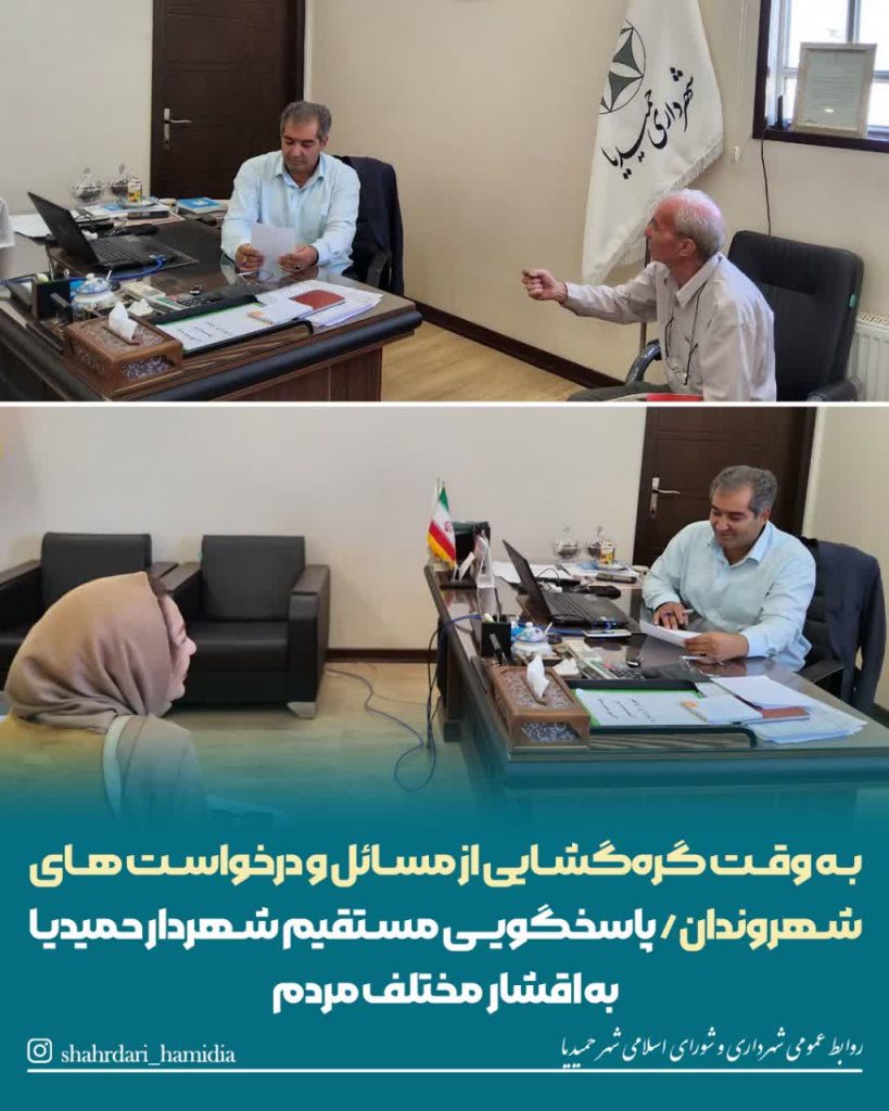 💢به وقت گره‌گشایی از مسائل و درخواست های شهروندان/ پاسخگویی مستقیم شهردار حمیدیا به اقشار مختلف مردم به گزارش روابط عمومی شهرداری حمیدیا، مرادعلی الله وردی؛ شهردار حمیدیا به روال یکشنبه‌های هر هفته و در راستای اجرای نهضت پاسخگویی، این هفته نیز، به‌صورت مستقیم با شهروندان دیدار و گفتگو کرد و دستورات لازم جهت رسیدگی به مسائل و دغدغه‌های مطرح‌شده را صادر کرد. شهروندان گرامی می‌توانند برای هماهنگی ملاقات حضوری با شهردار، با شماره تلفن ۳۸۲۲۴۲۹۰ تماس گرفته یا با مراجعه به دفتر ارتباط مردمی شهرداری، نسبت به تکمیل فرم درخواست ملاقات اقدام نمایند.