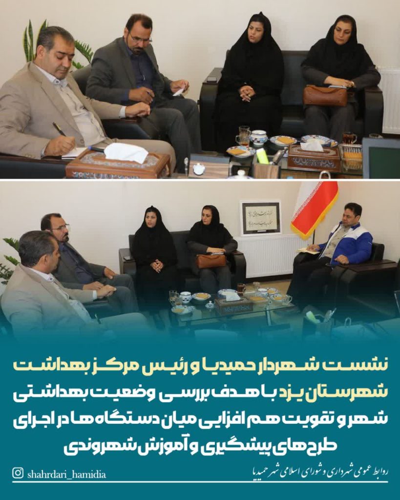 💢نشست شهردار حمیدیا و رئیس مرکز بهداشت شهرستان یزد با هدف بررسی وضعیت بهداشتی شهر و تقویت هم‌افزایی میان دستگاه‌ها در اجرای طرح‌های پیشگیری و آموزش شهروندی