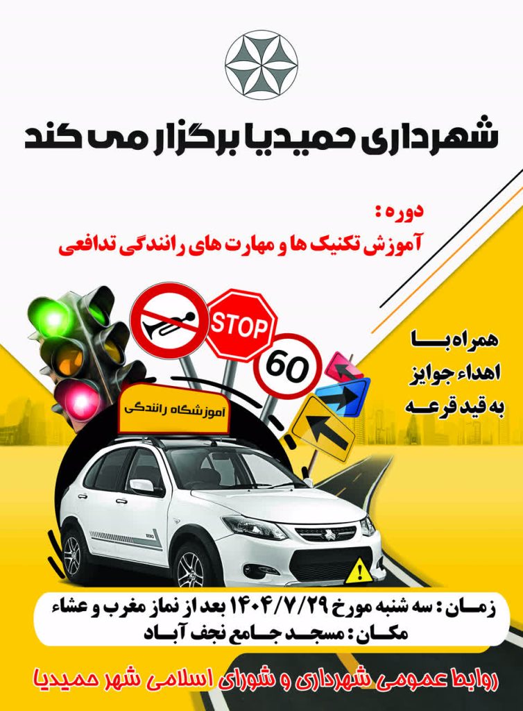 به گزارش روابط عمومی شهرداری حمیدیا، سید امیر حسین آسایش، مسئول واحد ترافیک شهرداری، از برگزاری یک دوره آموزشی کاربردی برای شهروندان خبر داد و گفت: دوره رایگان آموزش “تکنیکها و مهارتهای رانندگی تدافعی” روز سهشنبه، ۲۹ مهرماه ۱۴۰۴، پس از نماز مغرب و عشاء در مسجد جامع نجفآباد برگزار خواهد شد.
